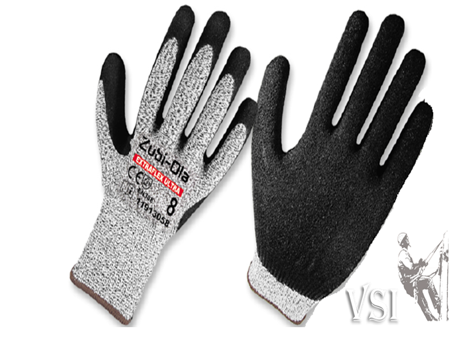 ZUBIOLA 11913058/59/60 GUANTES FIBRA HPPE, RECUBIERTOS EN NITRILO DIP NORMAL NIVEL 5 “EXTRAFLEX ULTRA”. HPPE. Fibra de polietileno de muy alta densidad que, a igual peso, es diez veces más resistente que el acero. Brinda excelente resistencia al corte y a la abrasión. Están indicados para actividades de ensamblaje de automoción, manipulación de piezas puntiagudas o con aristas vivas, manipulación de chapas metálicas, montaje y mantenimiento. Composición: 78% HPPE fiber. 2% glass fiber. 20% Nitrilo. Color: Gris/Negro. Tallas: 8, 9 Largo: 10” (25.4cm) Peso: 80 gr. NORMA EN388
