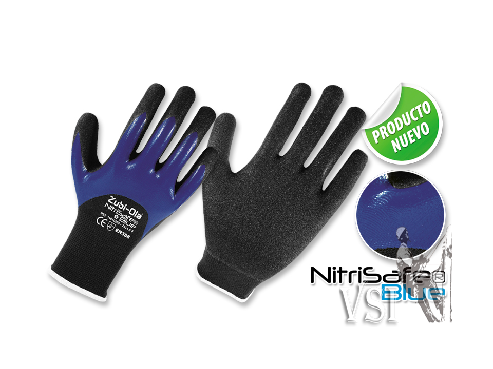 Guantes Zubiola Poliéster 13 gauge, recubiertos en Nitrilo 3/4 DIP // DOBLE DIP “NitriSafe Blue”.